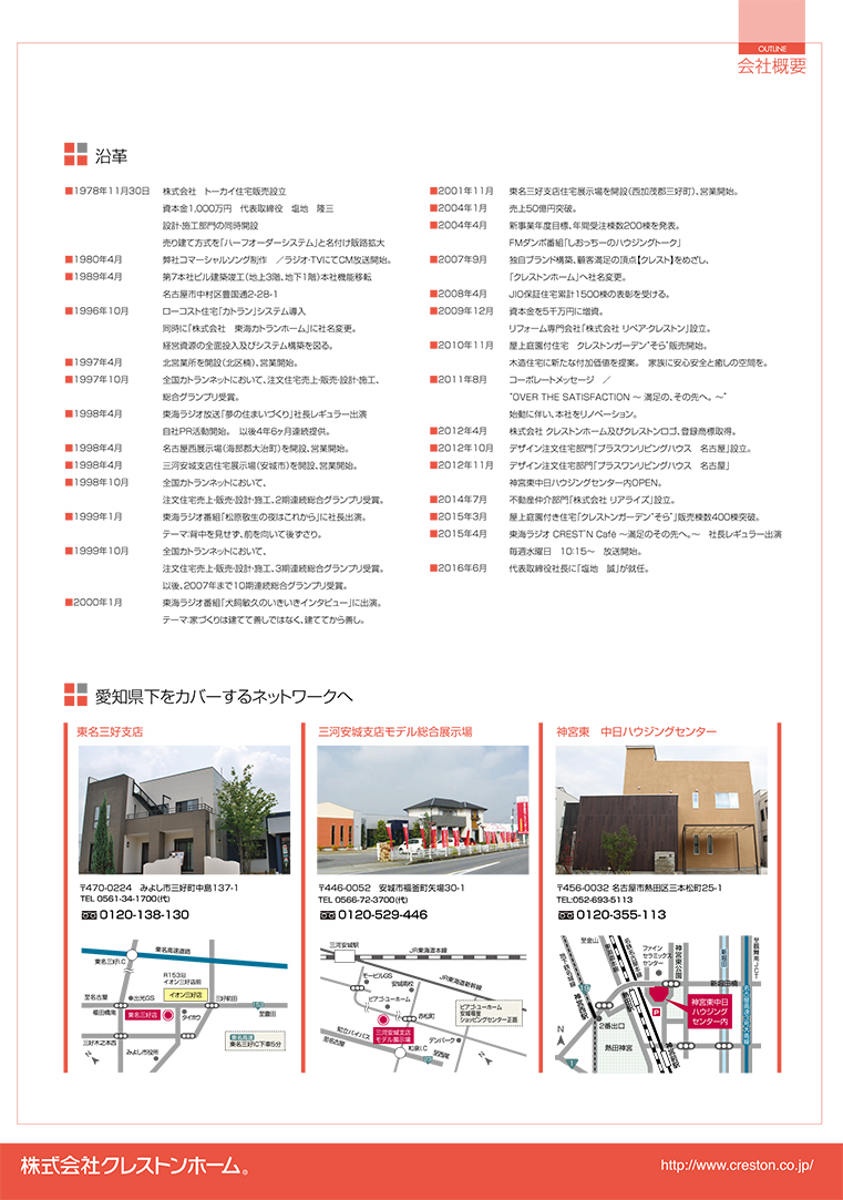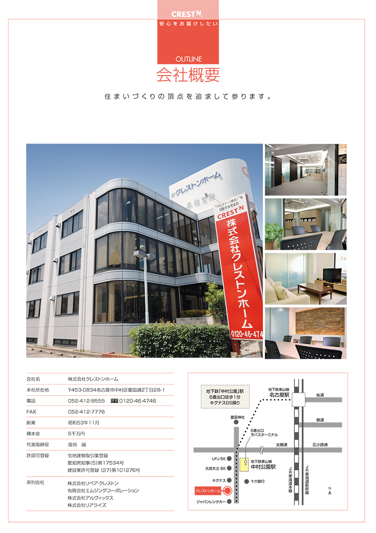 名古屋市中村区、住宅全般をサポートするクレストンホーム様の会社案内。企業としての立ち位置の高さを明確にするため、上質な紙を贅沢に使用し、情報・デザインだけでなく、手触りにもこだわった提案をいたしました。 名古屋のデザイン事務所 新島村屋<ホームページ制作サイト>名古屋のデザイン事務所 新島村屋<パンフレット制作サイト>