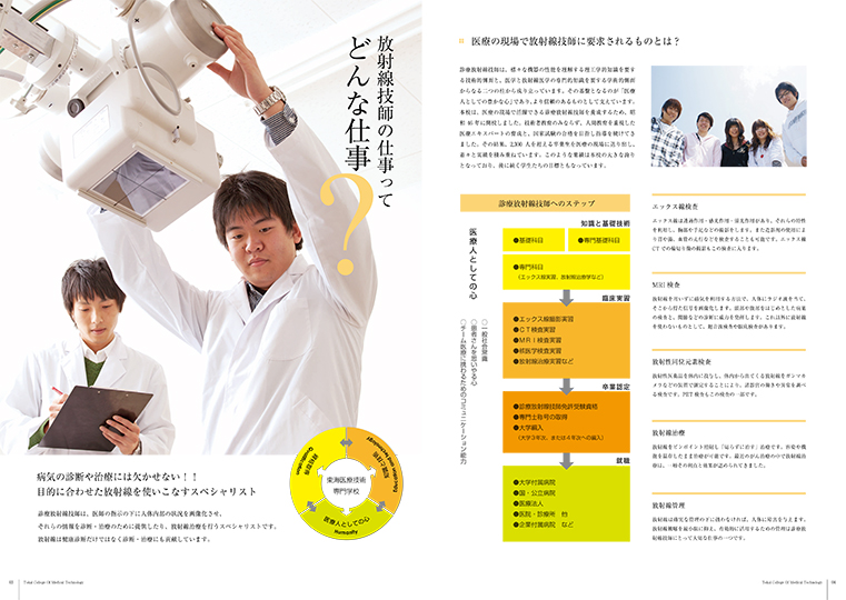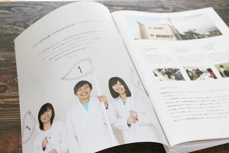 岡崎市にある、放射線技師を育てる専門学校の学校案内。ターゲットは医療業界を目指す学生ということもあって、表紙からインパクトのあるコピーと写真で引 きを強くしました。撮影も当日在籍している学生を巻き込んで、勢いその場でモデルに引っ張り込んで楽しい撮影現場になりました。