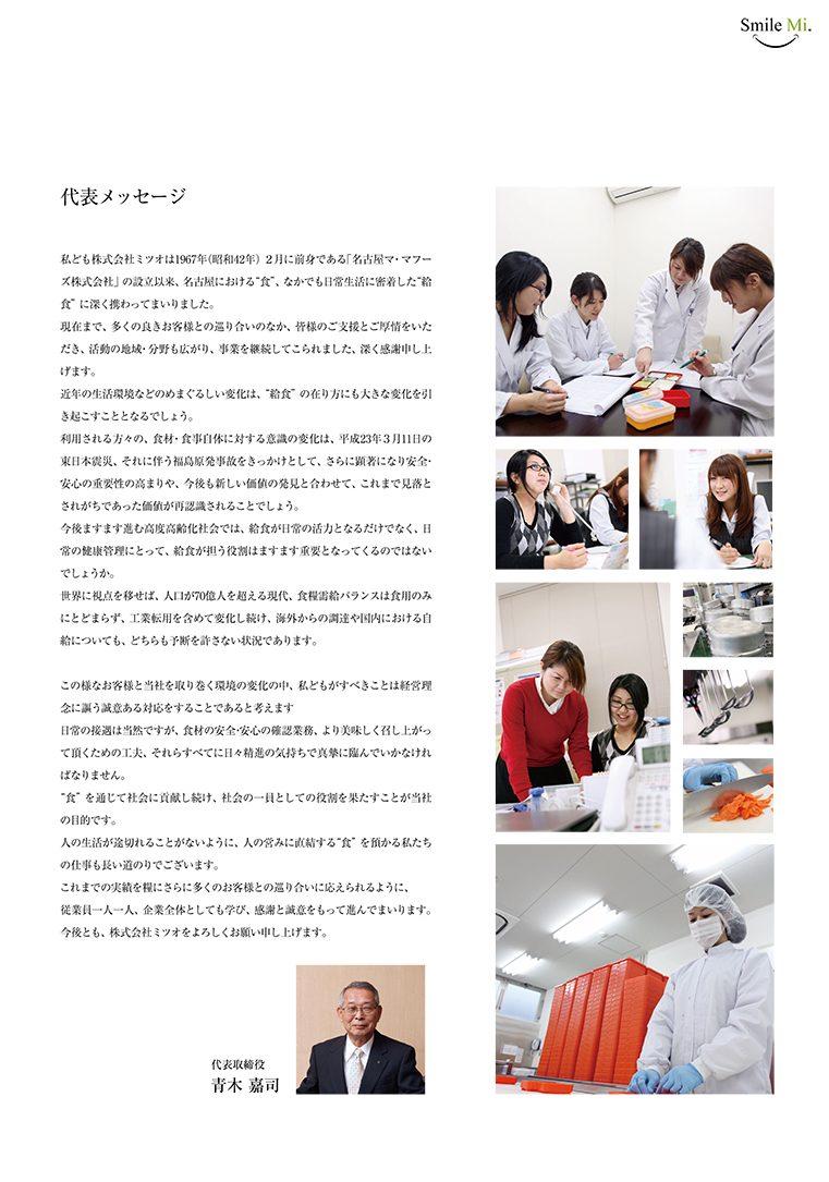 ケータリング・給食などをサポートする「株式会社ミツオ」様の会社案内。「医療」「学校」「企業」など、多岐にわたるサポートに対して適材適所な営業を 行っているため、ファイル型のパンフレットを制作することで、「目的・用途に合わせた組み合わせ」で、お客様へのプレゼンに挑める構成になっています。 名古屋のデザイン事務所 新島村屋<ホームページ制作サイト>名古屋のデザイン事務所 新島村屋<パンフレット制作サイト>