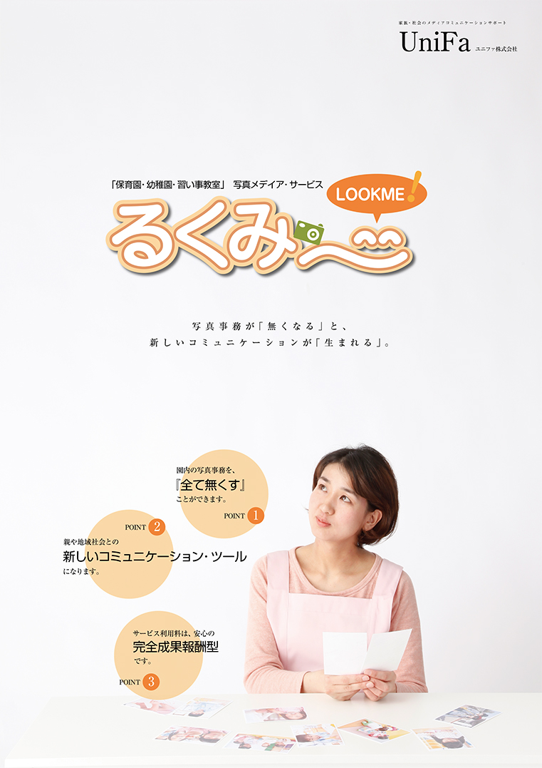 幼稚園や保育園をターゲットにした、ネット写真販売システムのサービス案内パンフレット。新規事業の中で、「いかにターゲットに対して情報やサービス・メ リットポイントなどを的確に伝えるか」を意識して構成しました。配布用のパンフレットということもあり、「基本見てもらえない」という前提の中で、表紙か らあえてネガティブポイントを訴求したものになっています。 名古屋のデザイン事務所 新島村屋<ホームページ制作サイト>名古屋のデザイン事務所 新島村屋<パンフレット制作サイト>