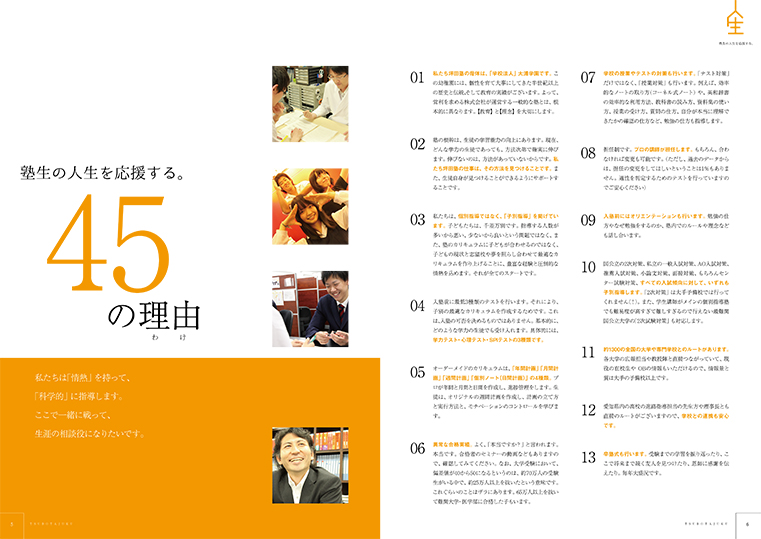 名古屋市千種区を中心に学習塾を展開されている青藍義塾様の、コンセプトブック。これまでの塾のありかたを一掃し、「学ぶ」ことに対する新しい方法論で、 結果を残してこられています。そんな「学習を科学する」という塾の理念をわかりやすく学生や保護者の皆様に理解していただこうと作成したコンセプトブック です。 名古屋のデザイン事務所 新島村屋<ホームページ制作サイト>名古屋のデザイン事務所 新島村屋<パンフレット制作サイト>