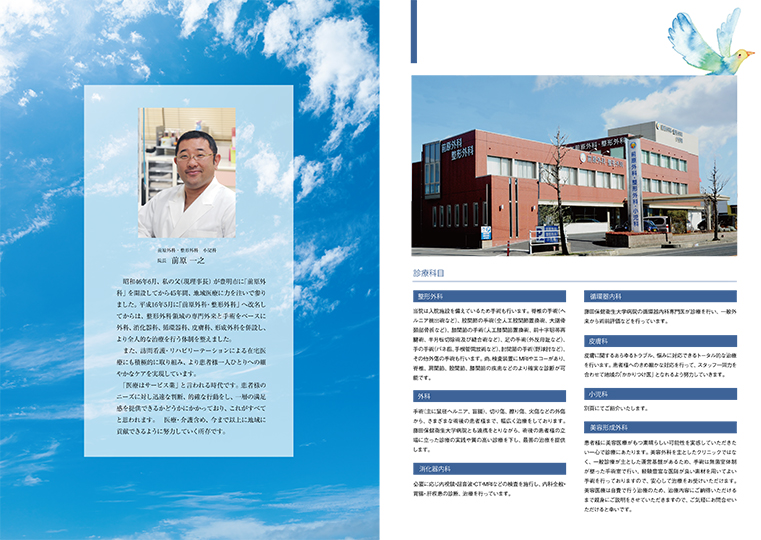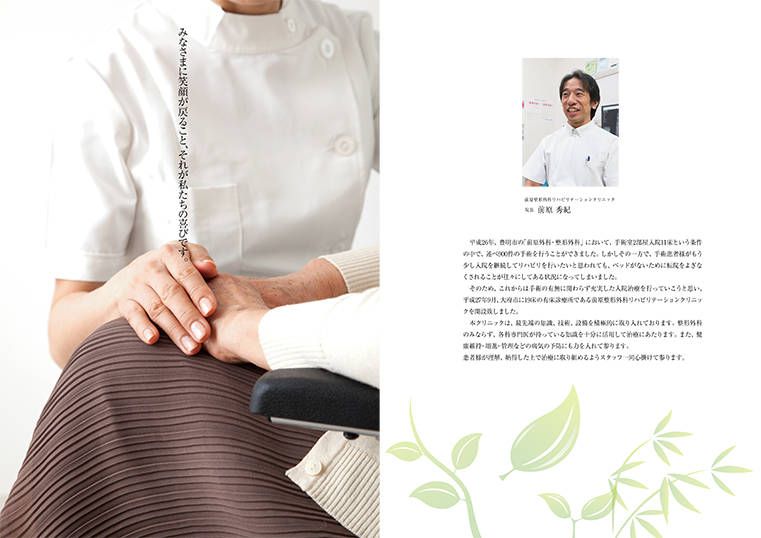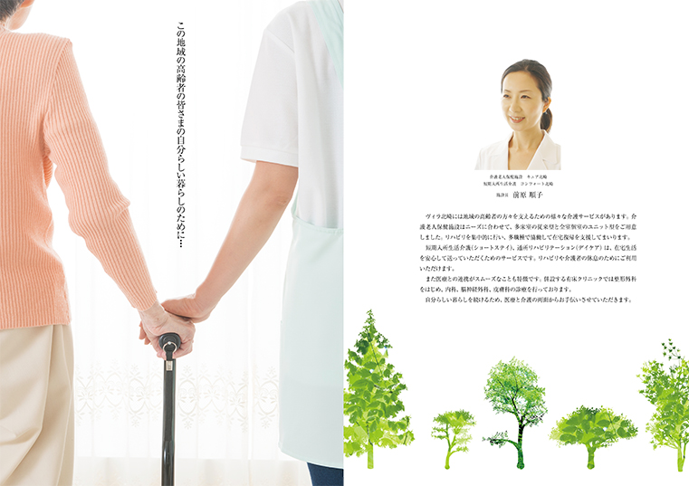 愛知県豊明市の医療法人のパンフレット。通常の医療機関だけでなく、リハビリテーション病院やデイケア・老人介護施設などを展開されている医療法人ということで、各施設ごとにパンフレットを作成し、デザインを統一させていくことでブランドイメージの向上を図るパンフレットとなりました。